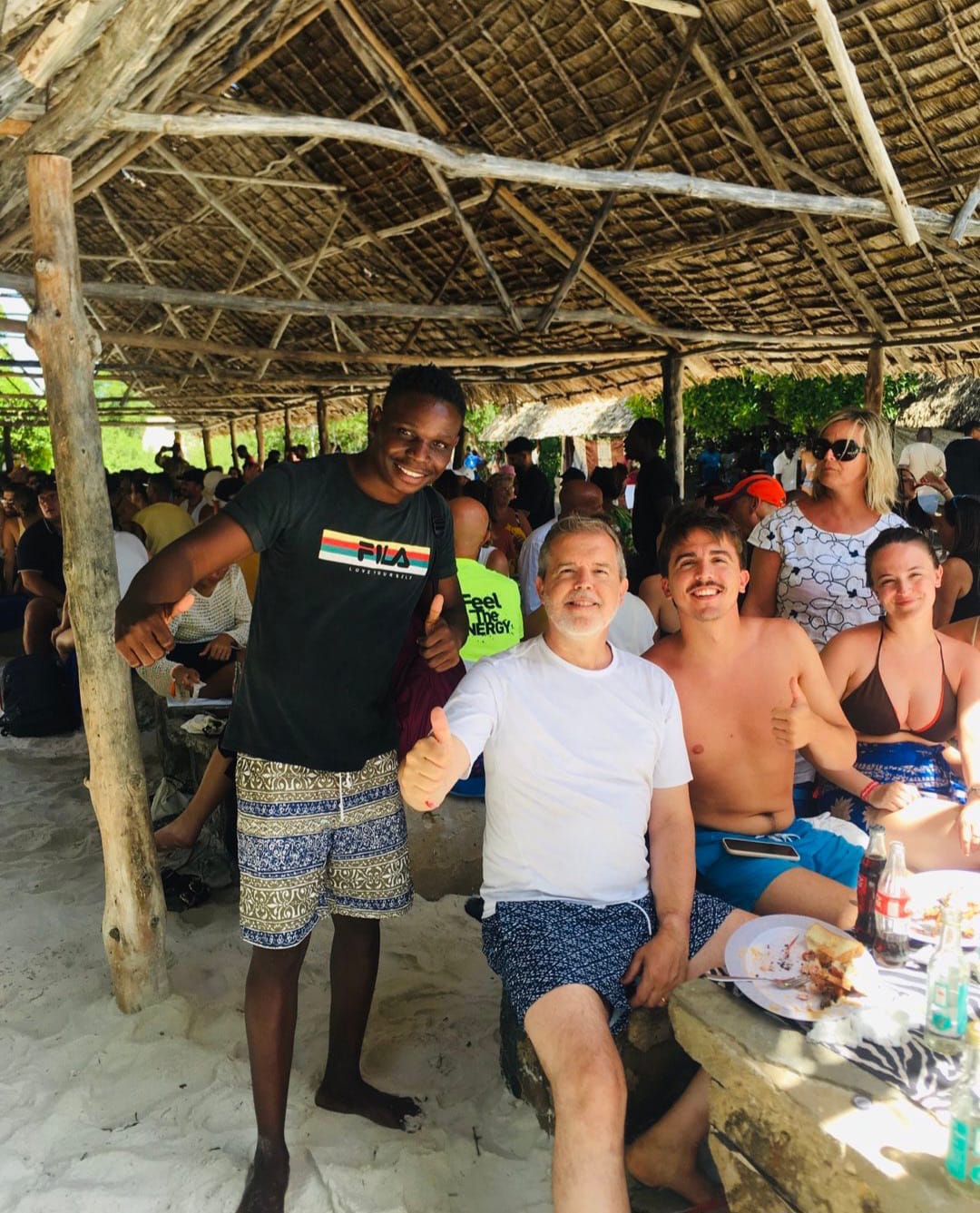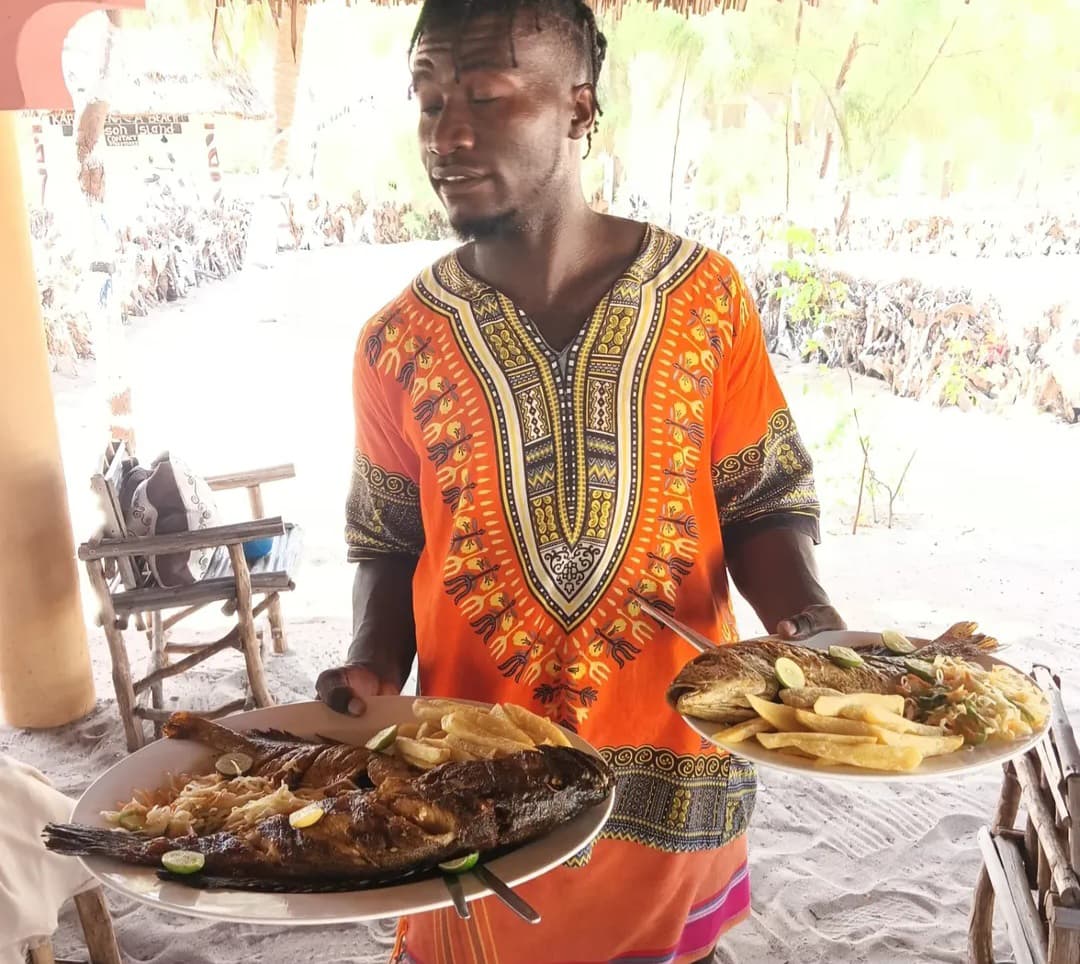 Il pranzo si svolge in un ristorante africano autentico, con tetto in makuti, radici di mangrovie e pavimento di sabbia.